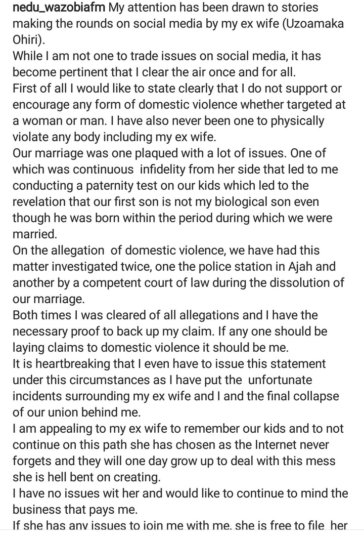 My attention has been drawn to stories making rounds on social media by my ex wife(Uzoamaka Ohiri).
