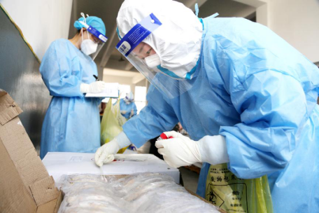 A medical worker takes samples on imported fish for COVID-19 nucleic acid test at a refrigeration house in Lianyun district, Lianyungang, east China's Jiangsu province, Aug. 11, 2021. (Photo by Wang Chun/People's Daily Online)