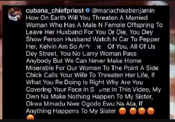 The recent saga between Big Brother Naija season 6 star, Maria, and Cubana Chief Priest has been trending on various social media platforms. It all started after Cubana Chief Priest claimed that Maria snatched his sister's husband, Kevin. He also claimed that Maria called his sister on phone and threatened her to leave Kevin.