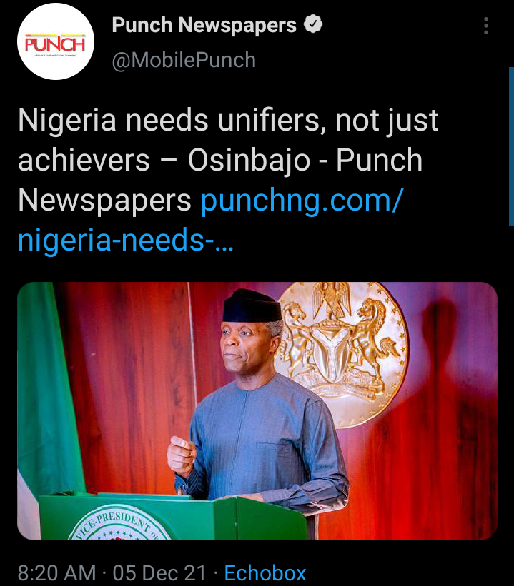 Recently, Vice-President Yemi Osinbajo says Nigeria needs not just achievers, but more importantly men and women who are bridge-builders and unifiers, who see the country’s ethnic diversity as a source of strength, and not ... Proceed to Read Full Article >>