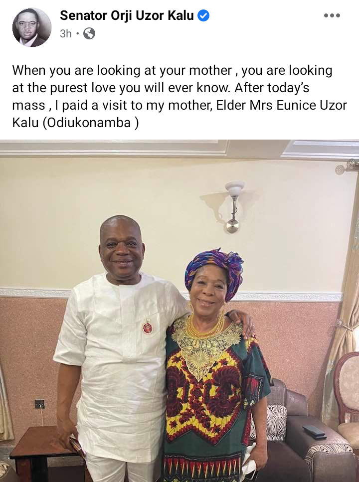 Senator Orji Kalu recently used his verified Facebook account to share a picture of himself together with his mother. Below is a screenshot of his post.